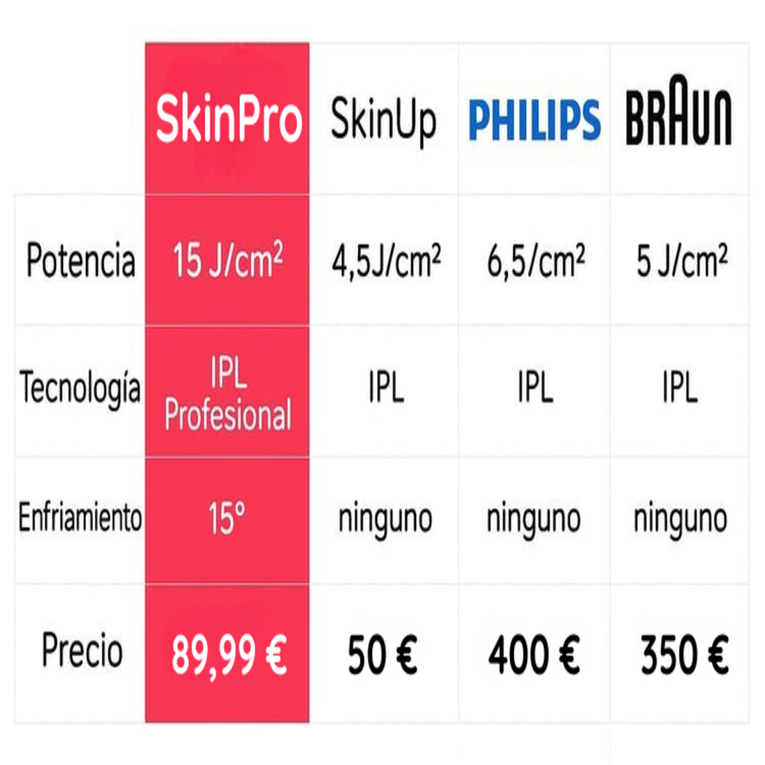 SkinPro es la depiladora más potente del mercado, con resultados de nivel clínico en casa. Con una energía de 15 J/cm² y tecnología de enfriamiento, ofrece resultados profesionales desde la comodidad de tu hogar.